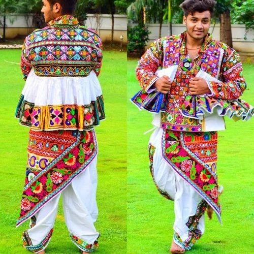 Women traditionally wear a three-piece dress called the ‘Chaniya Choli.’ It consists of a blouse (choli), a flared, ankle-length skirt (chaniya), and a long cloth draped over the shoulder (dupatta). The dresses are adorned with mirror work, embroidery, and vibrant patterns.